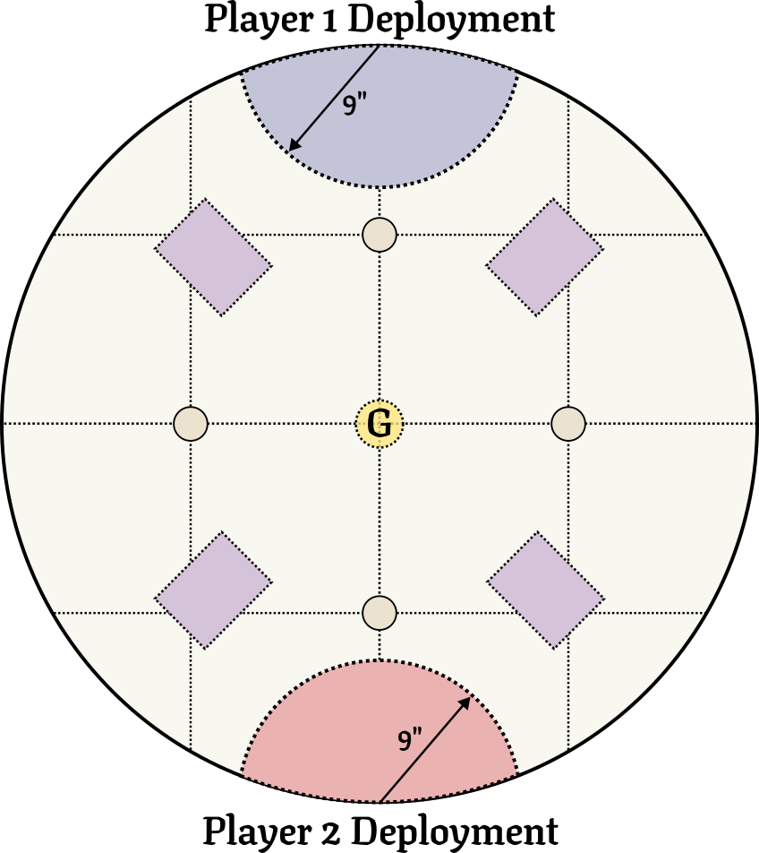 Each warband must deploy their entire force in their respective zone, regardless of whether a unit has flank or not. These zones are a circle 9 inches from the top and bottom points of the battlefield.