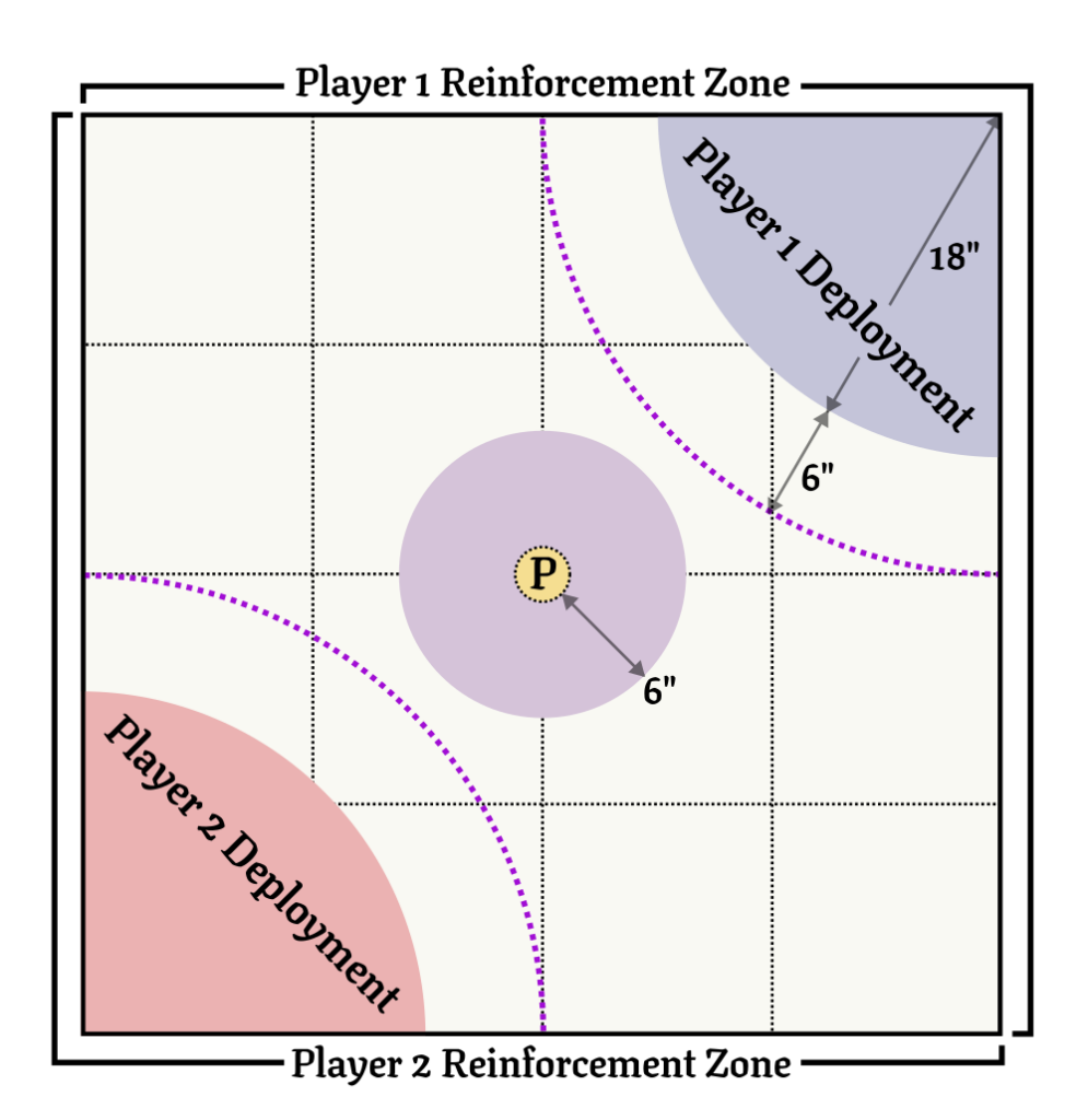 Place 9-12 pieces of terrain around a central objective (Labelled ‘P’ on the above map). Feel free to mark this objective with something fun and thematic- this is the Pyre and will be important later. The Pyre should be a 3 inch diameter piece of terrain that is treated as both impassable and obscuring.